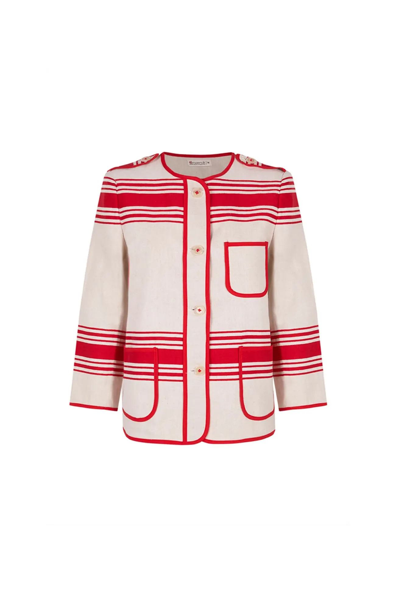 Chaqueta kaiku de lino, con un aire moderno y original. Corte recto y manga francesa. Rematada con vivos de algodón, en el interior y en el exterior. El estampado de rayas es originario del País Vasco francés.