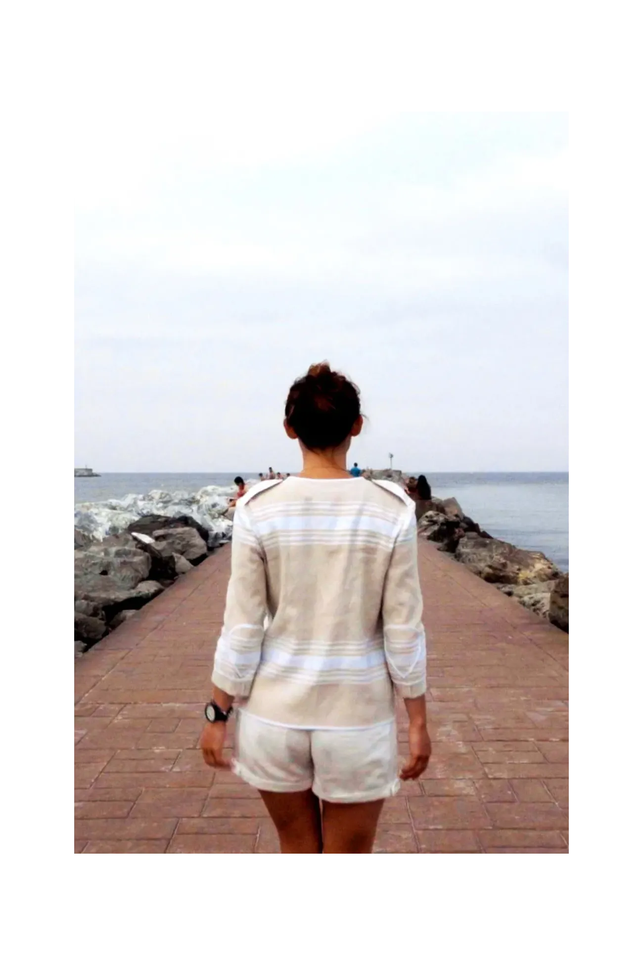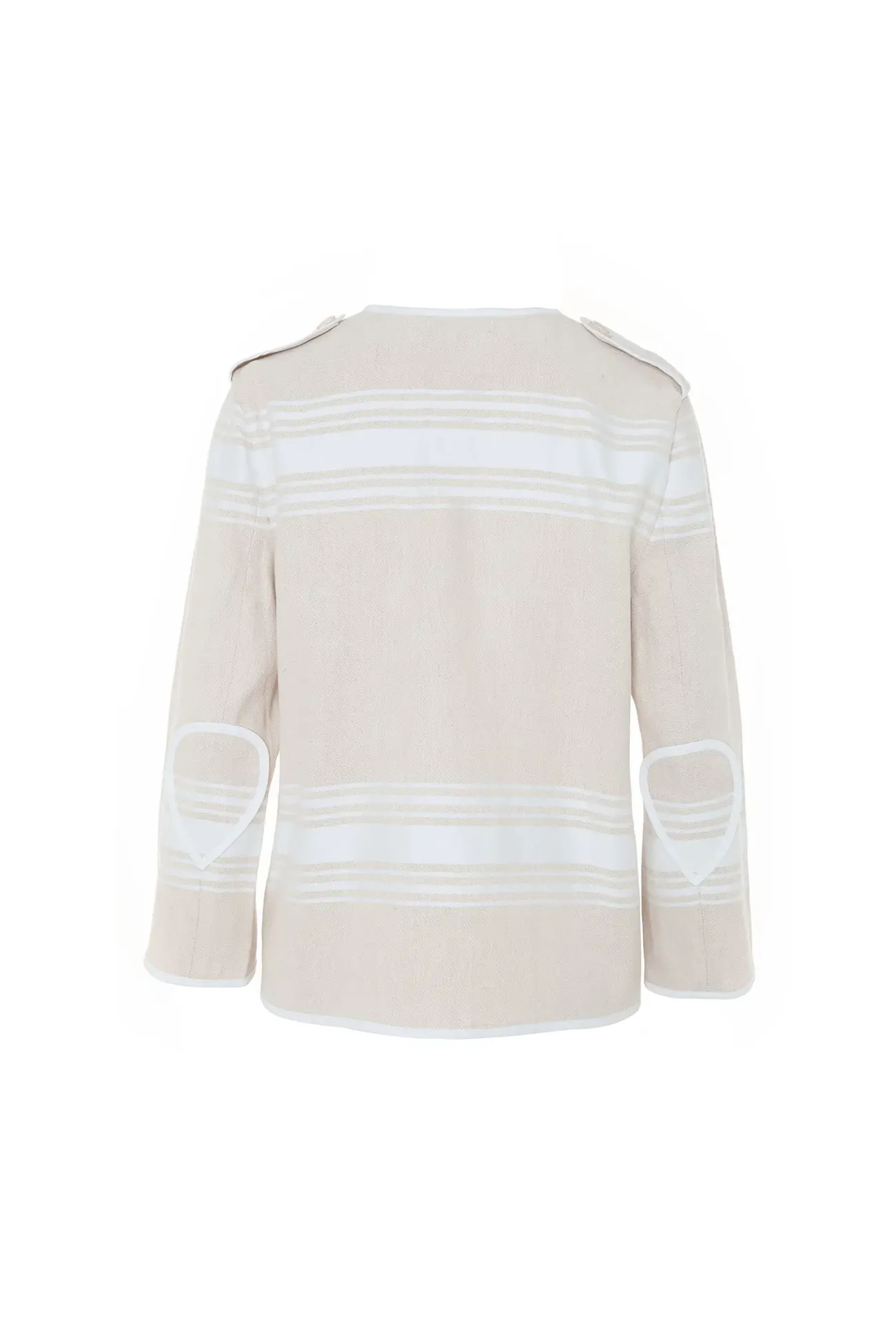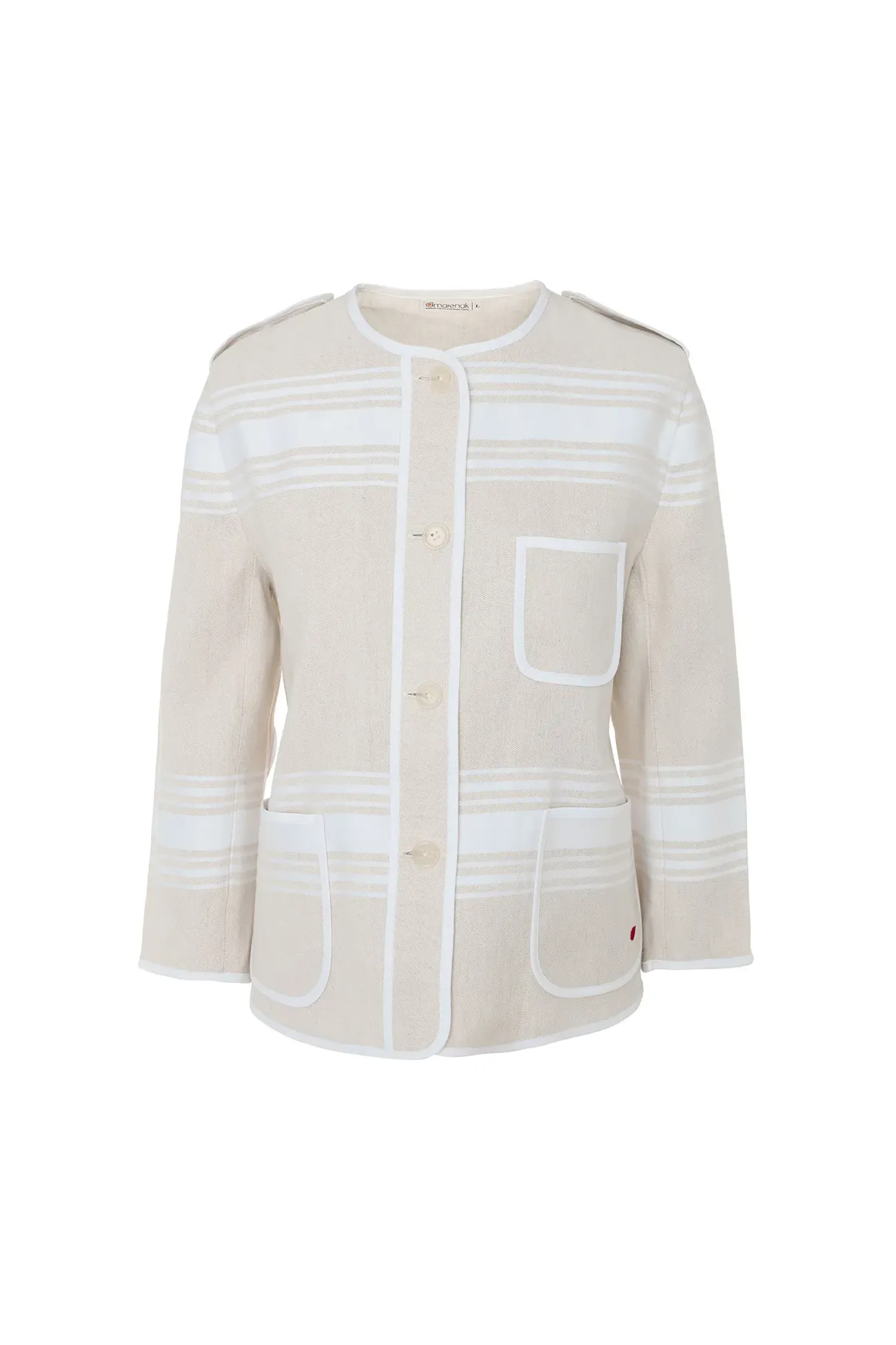 Chaqueta kaiku de lino, con un aire moderno y original. Corte recto y manga francesa. Rematada con vivos de algodón, en el interior y en el exterior. El estampado de rayas es originario del País Vasco francés.