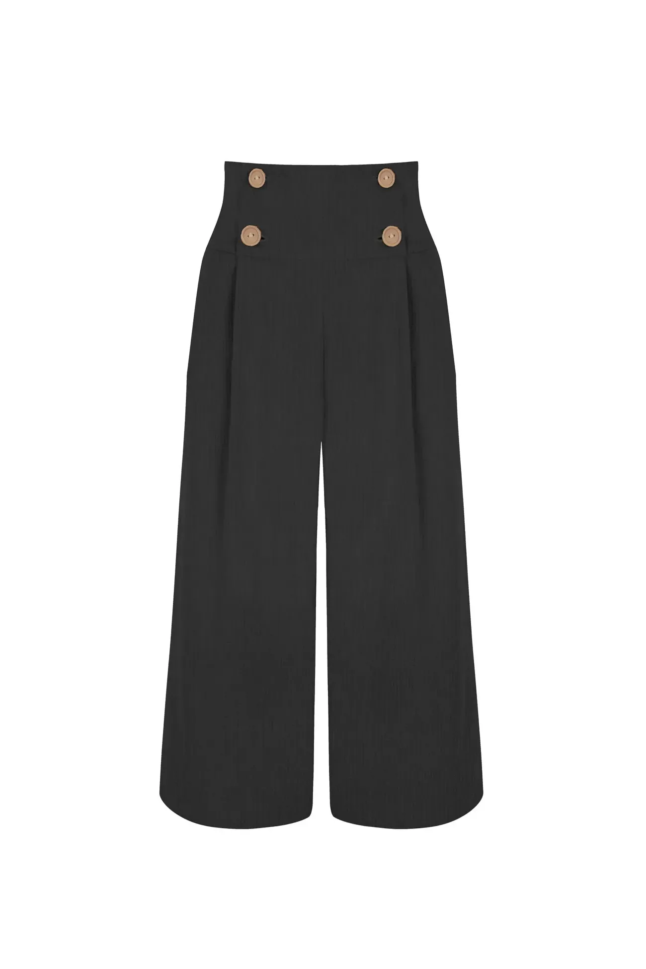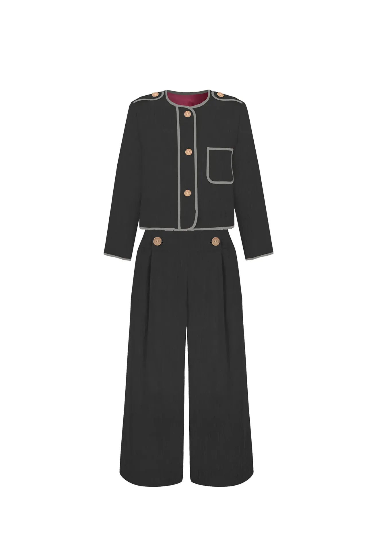 Pantalón de pana negra de talle alto inspirado en los “praka-mantala” tradicionales vascos. Corte entallado en cintura, cierre lateral con cremallera y botones frontales como guiño al diseño original. Confeccionado en algodón orgánico certificado GOTS.