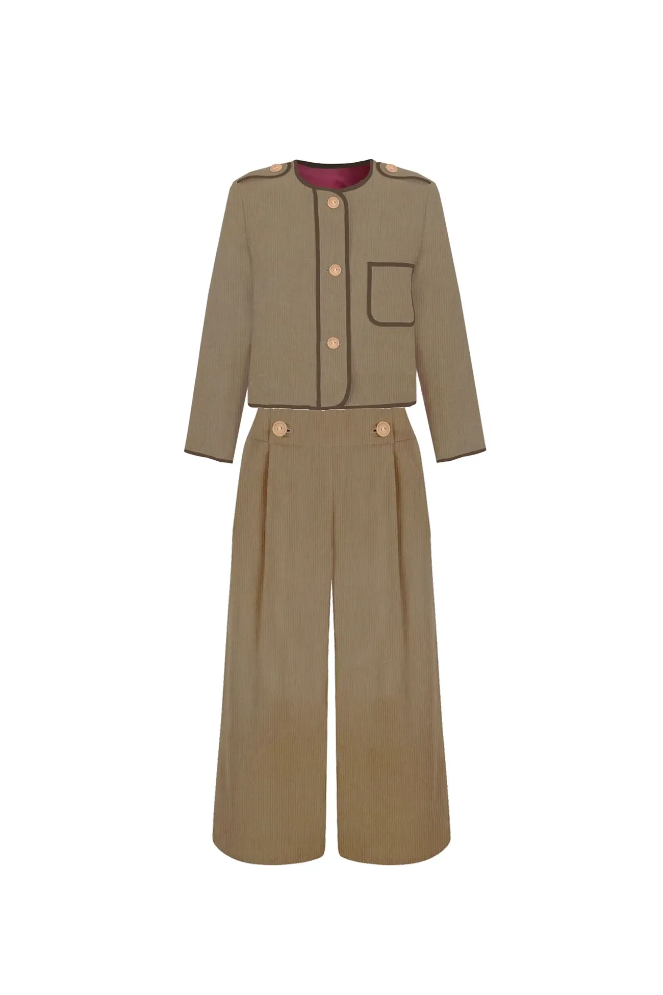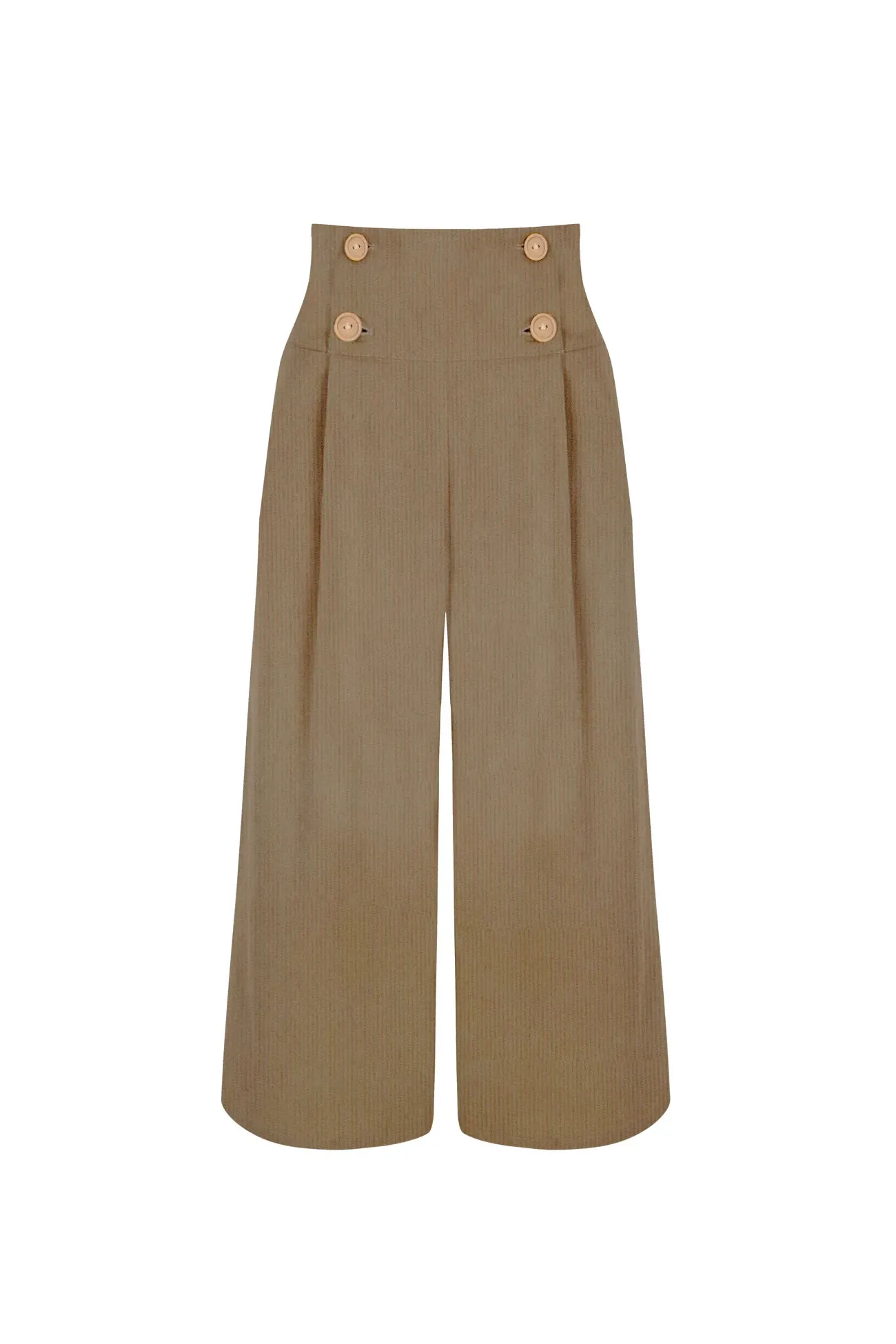 Pantalón de pana beige de talle alto inspirado en los “praka-mantala” tradicionales vascos. Corte entallado en cintura, cierre lateral con cremallera y botones frontales como guiño al diseño original. Confeccionado en algodón orgánico certificado GOTS.