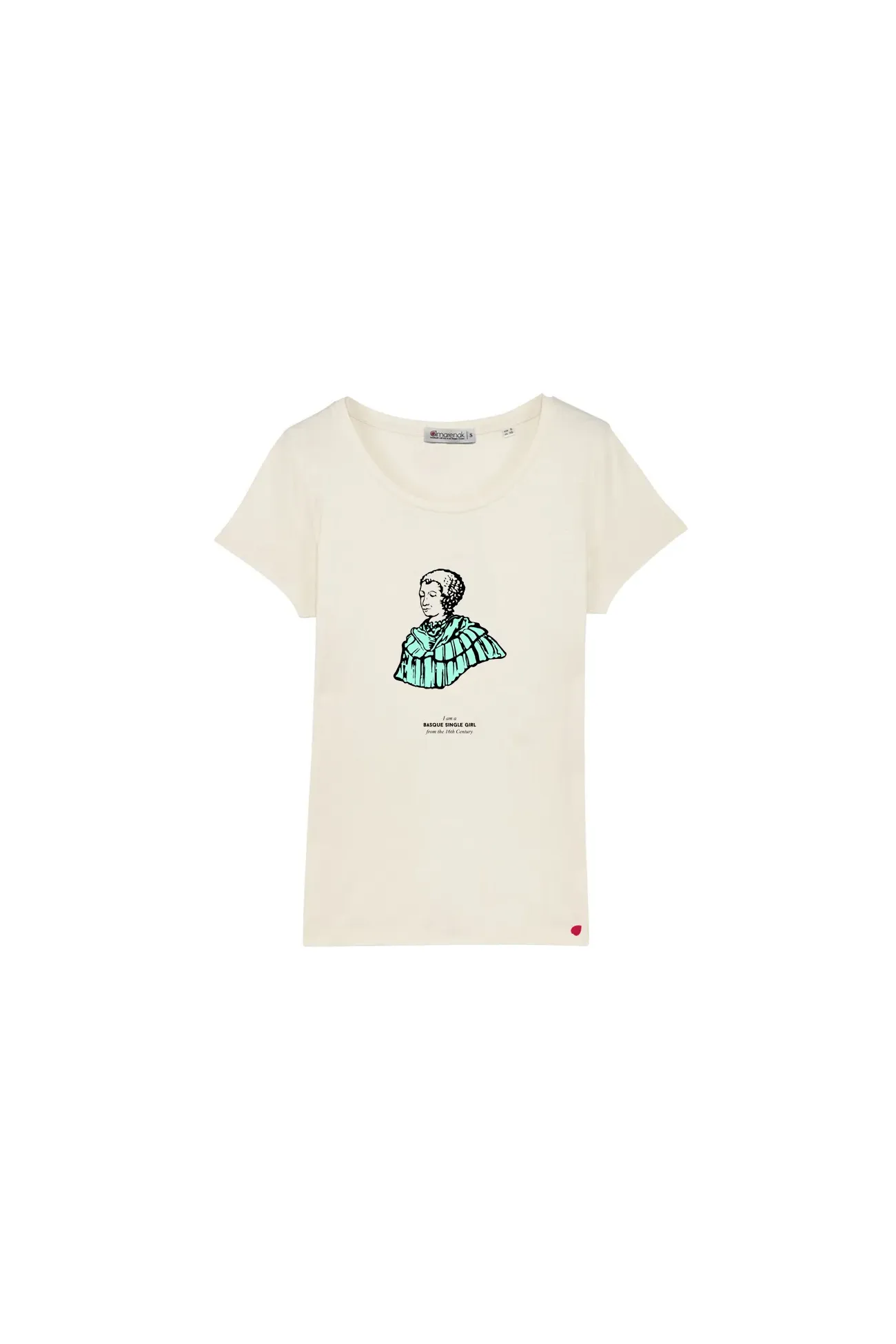 Camiseta de algodón orgánico GOTS. Disponible en modelo unisex y de mujer. La imagen de la camiseta parte de una ilustración de una mujer soltera vasca del siglo XVI. Combina genial con nuestra falda GONA GORRI y una chaqueta KAIKU.