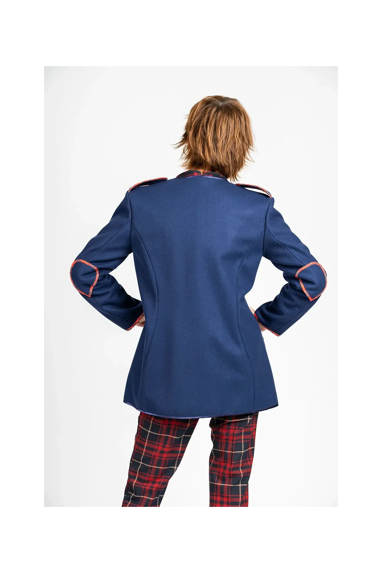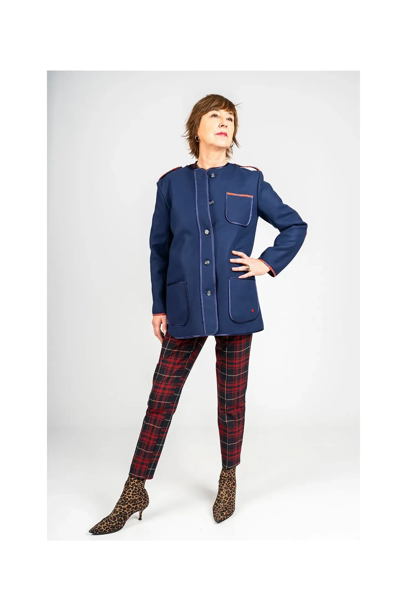 Chaqueta kaiku de paño de lana merino, con un aire moderno y original. Corte recto y ligero entalle en la espalda. La chaqueta va rematada con vivos en raso y estampados, en el interior y en el exterior. Hecha con cariño en el País Vasco.