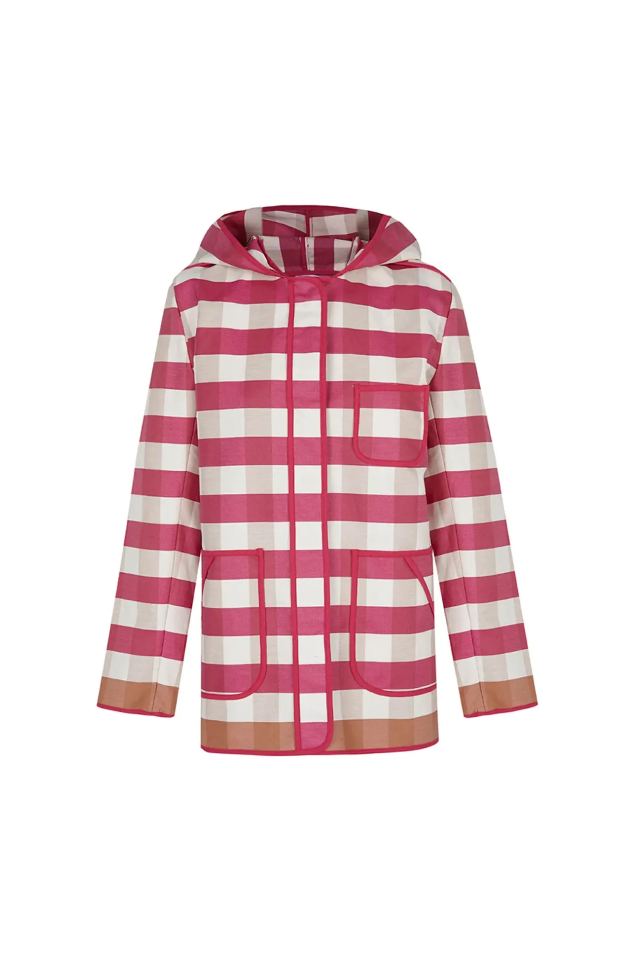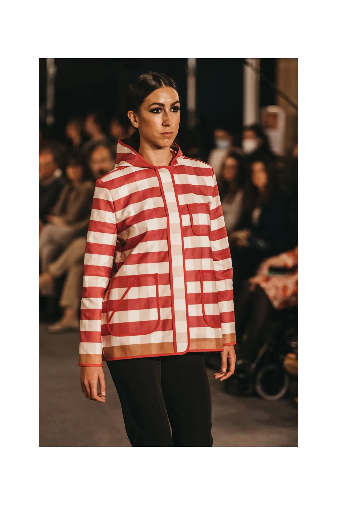 Kaiku con capucha e impermeable de algodón encerado, con un aire moderno y original y de corte recto. Va rematada con vivos de algodón, en el interior y en el exterior. El estampado de rayas es originario del País Vasco francés.